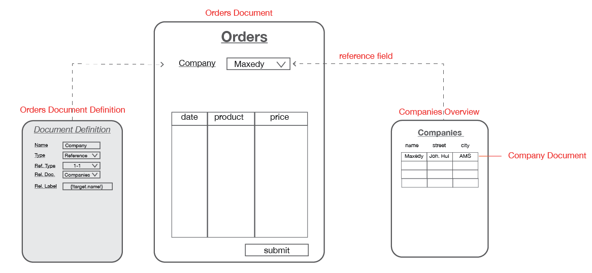 Example: There is an Order document that holds information on the number of purchased items per company. Because companies are also used in other processes, it has it's own Document Definition and therefore each company is a document itself. With the help of a Reference Field, the Order document can make use of the information stored in a Company Document. When information changes within the Company Document, this information also changes in the Order Document.